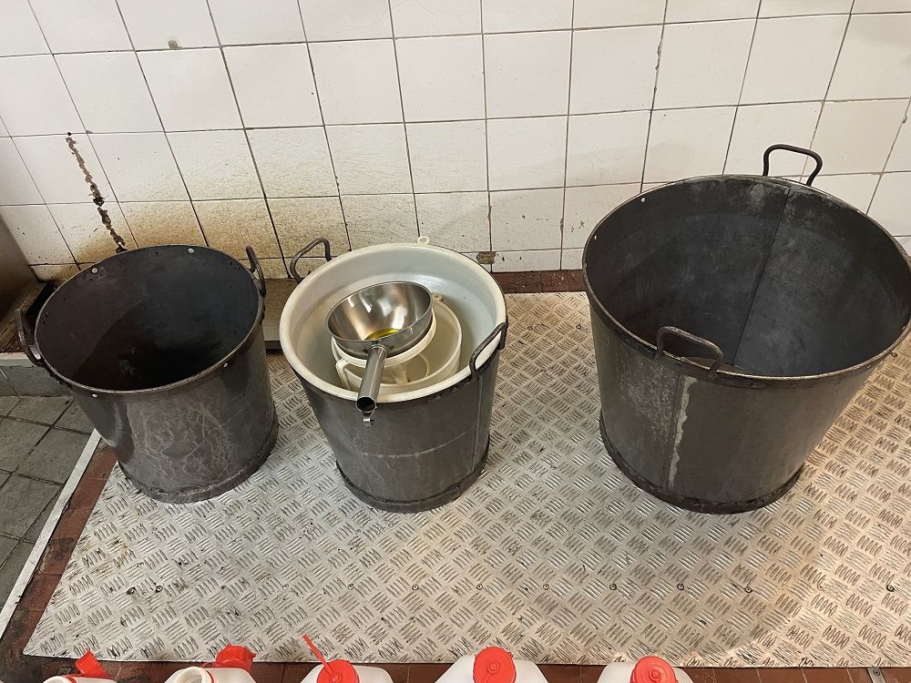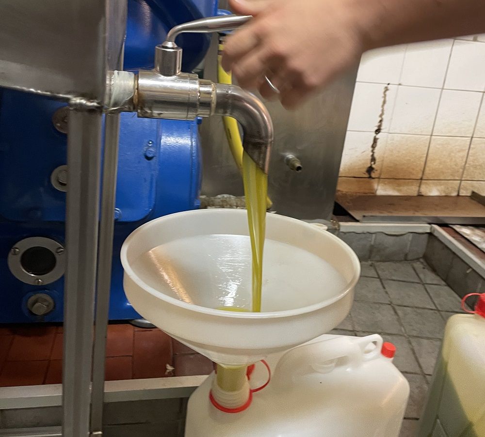 L’olio appena nato esce da un rubinetto d’alluminio: una delle ragazze del frantoio lo apre e usa un “turtaieu”, un grosso imbuto, per riempiie una tanica. Fuori, oltre la porta del frantoio, ad attenderlo come in una nursery, c’è una signora che lo aspetta impaziente.