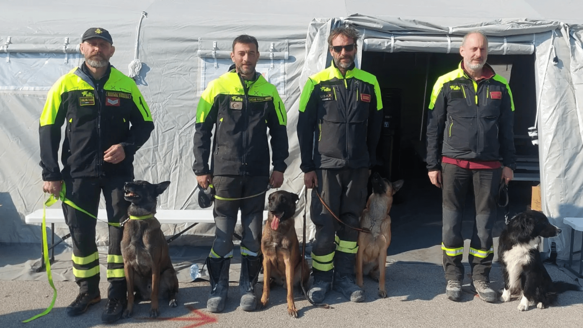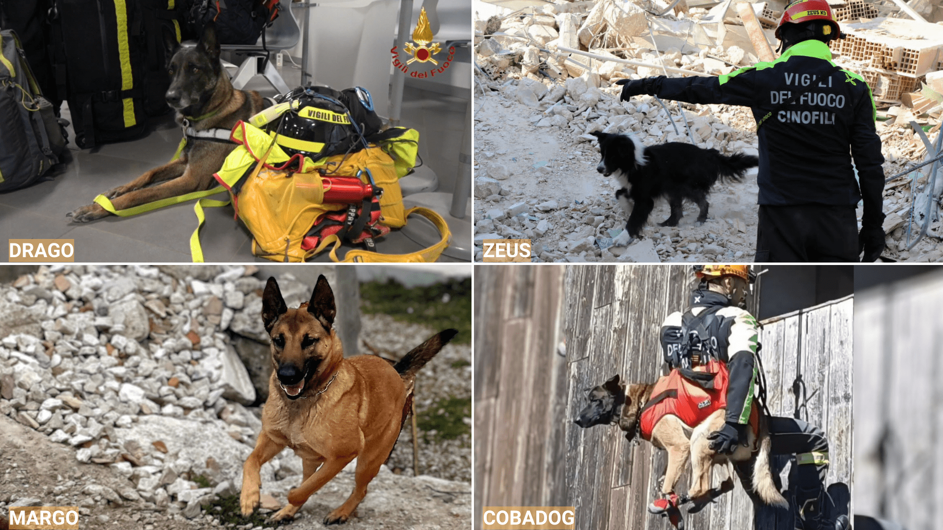 Cobadog, Drago, Margo e Zeus, rispettivamente pastori belga malinois di anni 4, 6, 4 e border collie di 4 anni e mezzo, sono le unità cinofile del Nucleo Cinofilo Regionale Toscana – Vigili del Fuoco inviate aggregate alle squadre USAR della Toscana nella Missione di Soccorso Internazionale a seguito del sisma in Turchia.
